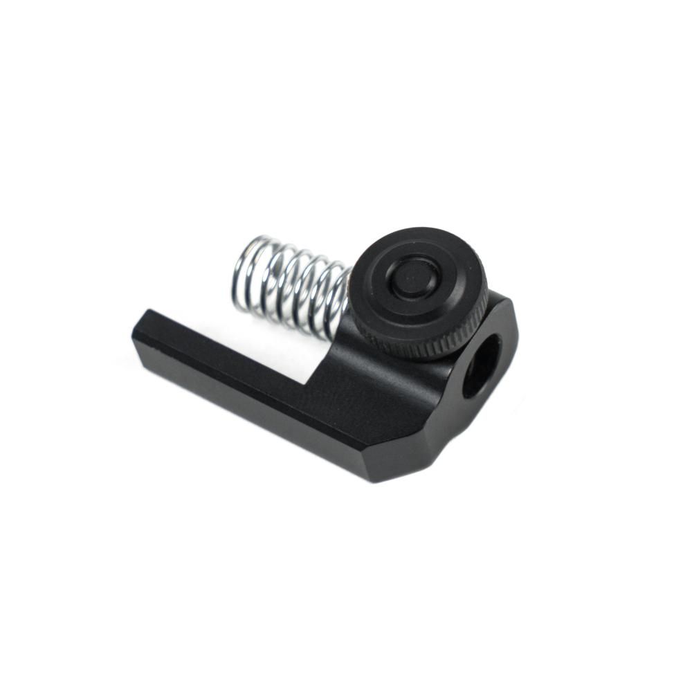 Предназначен для ограничения хода держателя абразива и предотвращения порчи лезвия абразивом, может использоваться на точилках TSPROF Профиль К03, Профиль К03 Pro, Профиль К4 всех модификаций. Ограничитель совмещен с парковкой, для фиксации штанги держателя абразива в горизонтальном положении. Интегрирован со стальной пружиной, для смягчения удара о корпус шарнирного узла. Изготовлен из легкого и прочного сплава авиационного алюминия с черным матовым анодированием. Крепится при помощи цилиндрической втулки с отверстием. Фиксирующая гайка при вращении смещает втулку, которая плотно обхватывает штангу, обеспечивая надёжное удержание положения.
