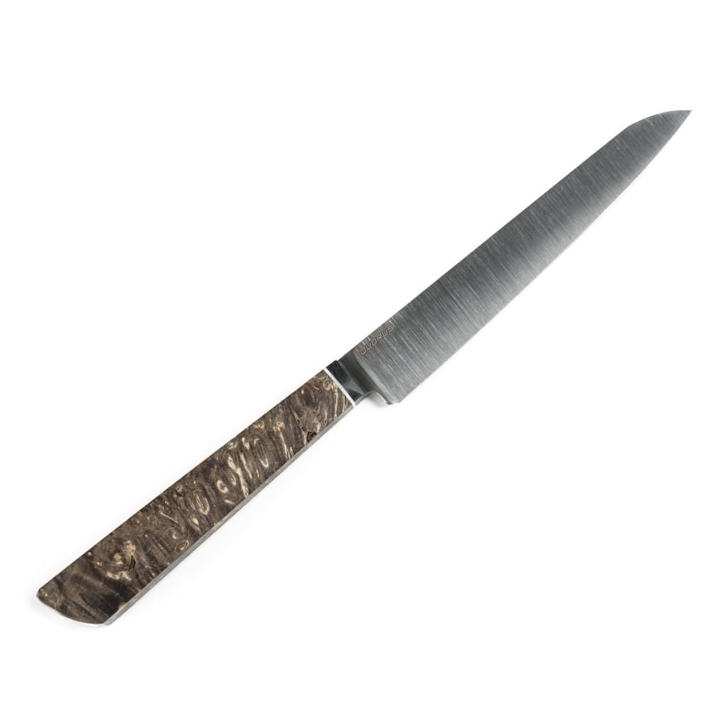 Клинок ножа имеет выпуклые линзовидные спуски от обуха, сведенные в ноль. Режущая кромка заточена с V-образным микроподводом, что обеспечивает тонкий и аккуратный рез, а также длительное удержание остроты. Утолщение на пятке клинка и скос обеспечивают дополнительную защиту от порезов при работе с ножом. Этот нож станет отличным универсальным инструментом для выполнения разнообразных задач на кухне, особенно при работе с мягкими продуктами.