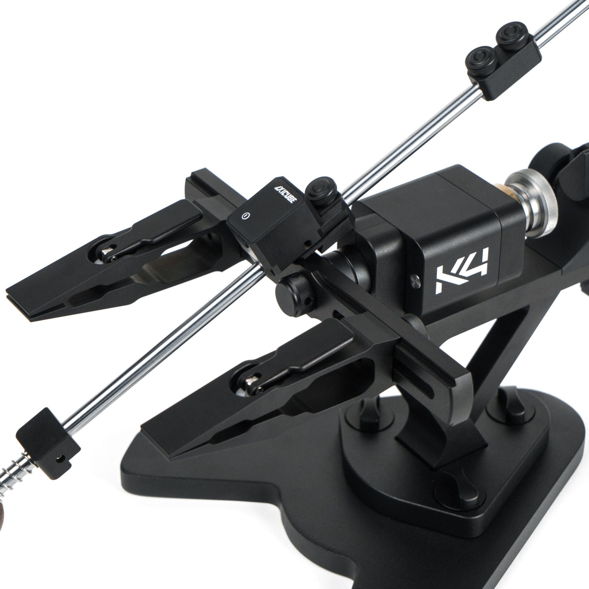 Угломер располагается на дальнем упоре штанги, с возможностью быстро устанавливать и снимать его для уменьшения нагрузки на абразив при работе и для удобства зарядки в удаленном от системы заточки места. Крепление на планку пикатинни, в сочетании со стопорным винтом и магнитом обеспечивает лёгкую и надёжную фиксацию угломера для точных измерений угла заточки. Зарядка устройства осуществляется через разъем USB type-C.Зажимы Quick