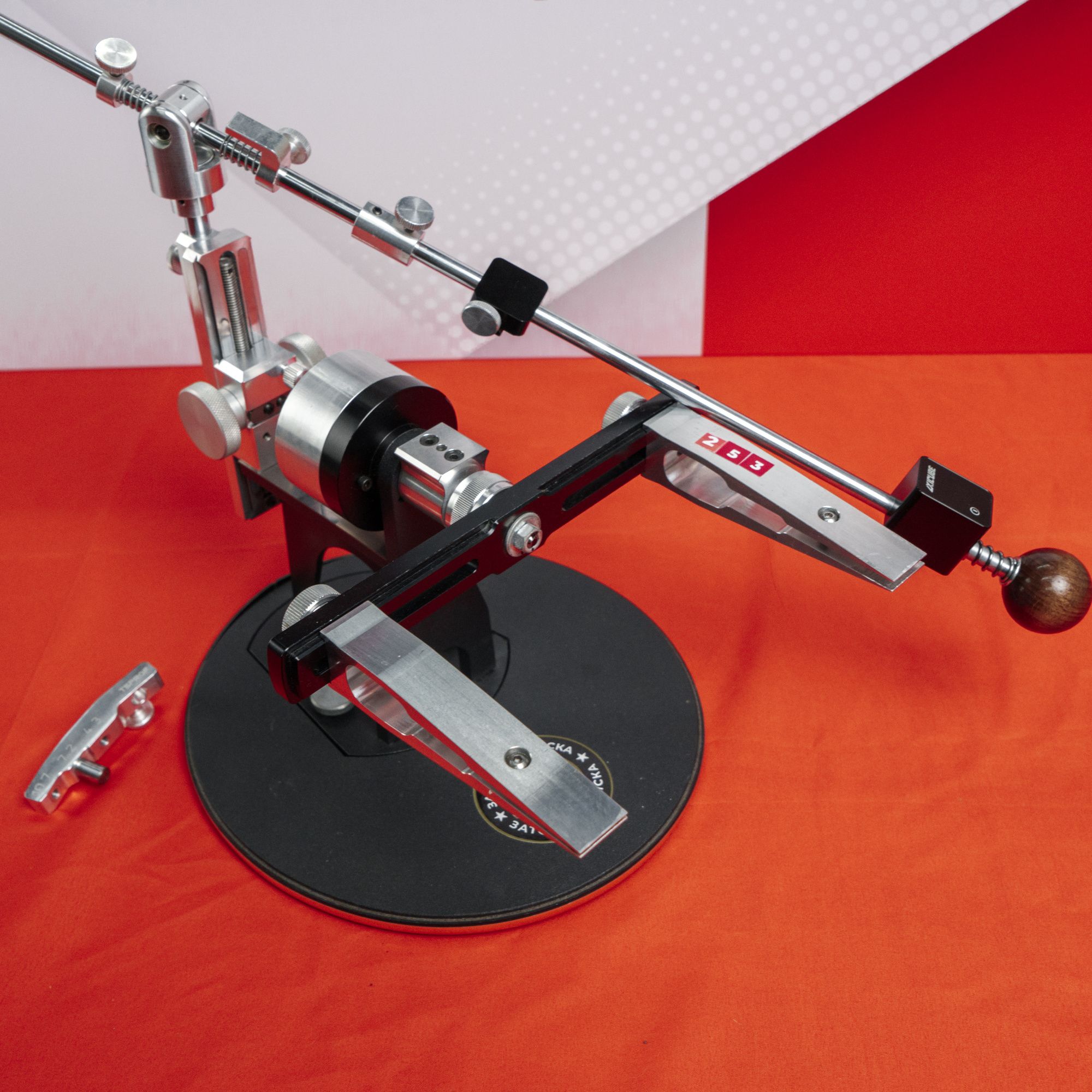 Универсальный держатель позволят использовать с точилкой любые абразивные камни как на бланках, так и без бланков. Держатель абразива не имеет металлической подложки, но благодаря специальной геометрии упоров позволяет фиксировать абразивы максимально надежно. Штанга держателя абразива имеет увеличенную длину в 694 мм, выполнена из стали и обладает высокой жесткостью. Штанга держателя — разборная и соединяется алюминиевой втулкой-муфтой, с посадочным креплением «на три точки», что дает максимальную соосность соединения. Для регулировки штанга оснащена удобным винтом-барашком, соединение штанги происходит одним движением.