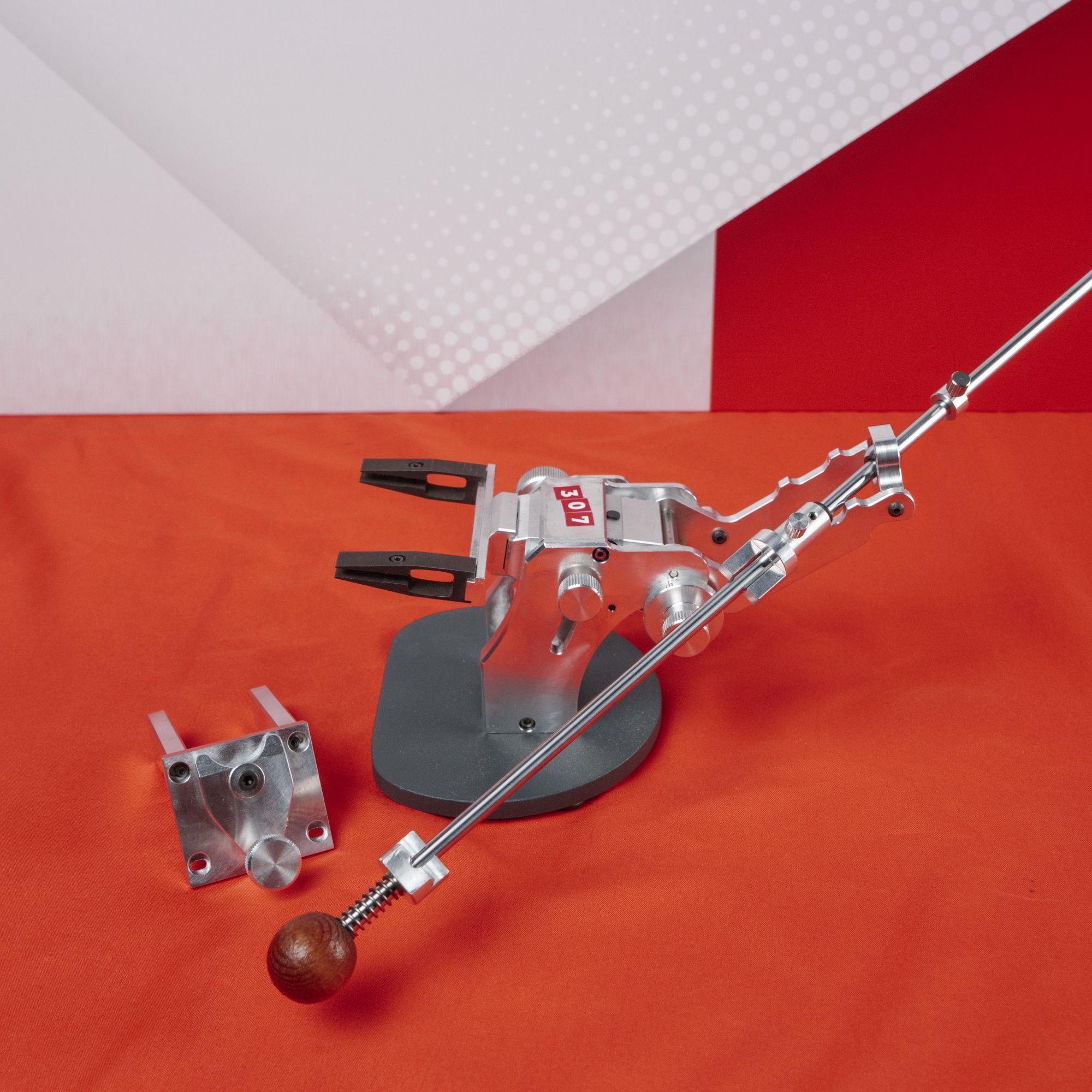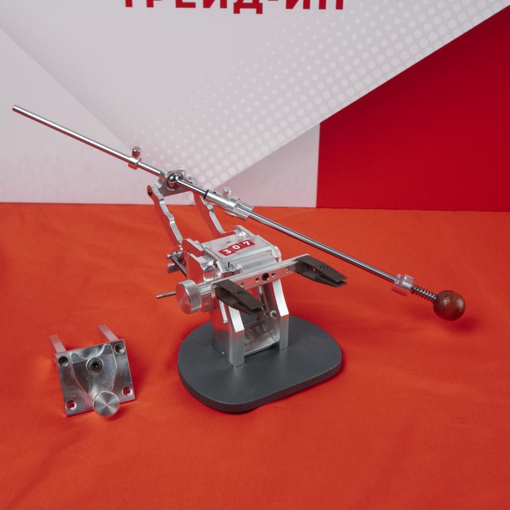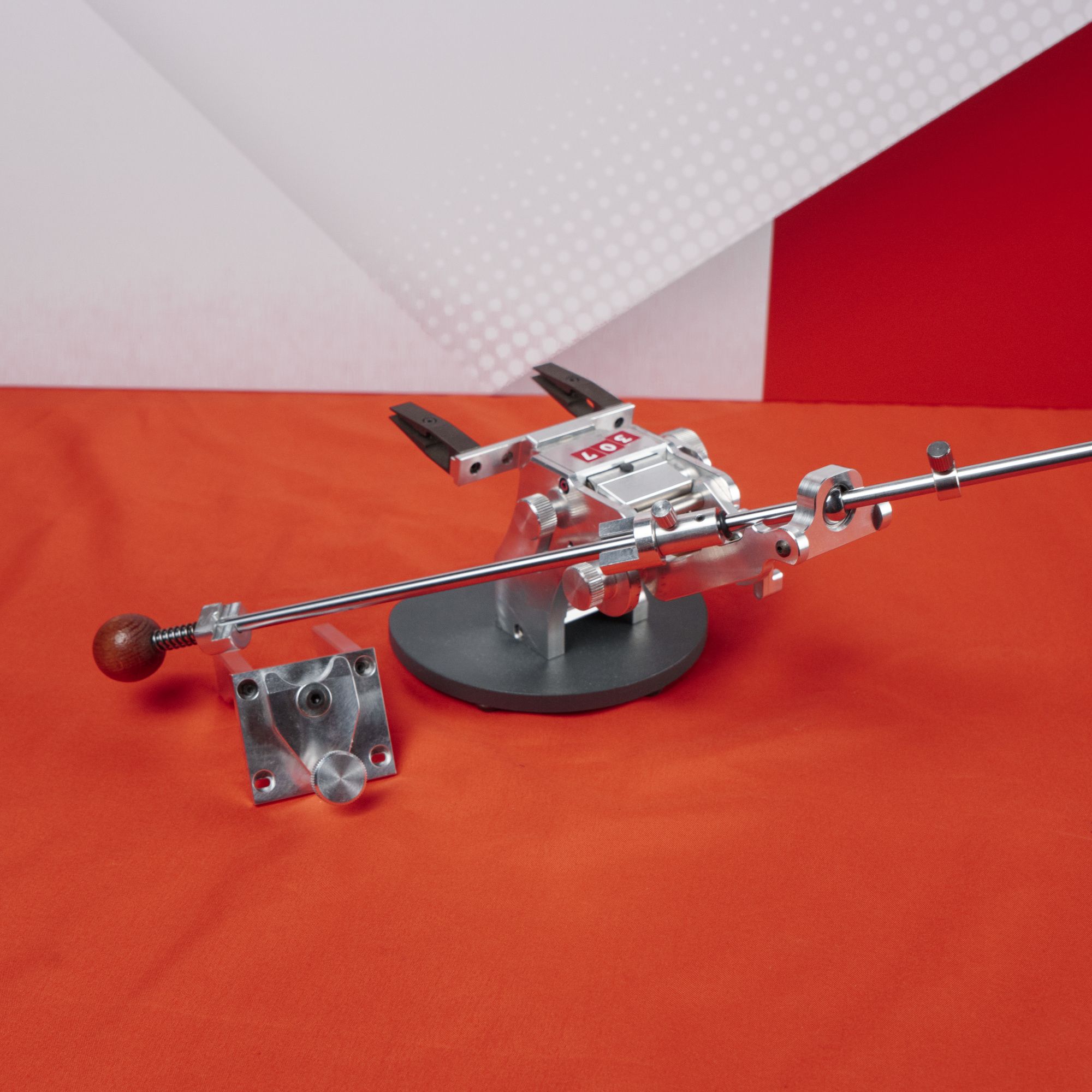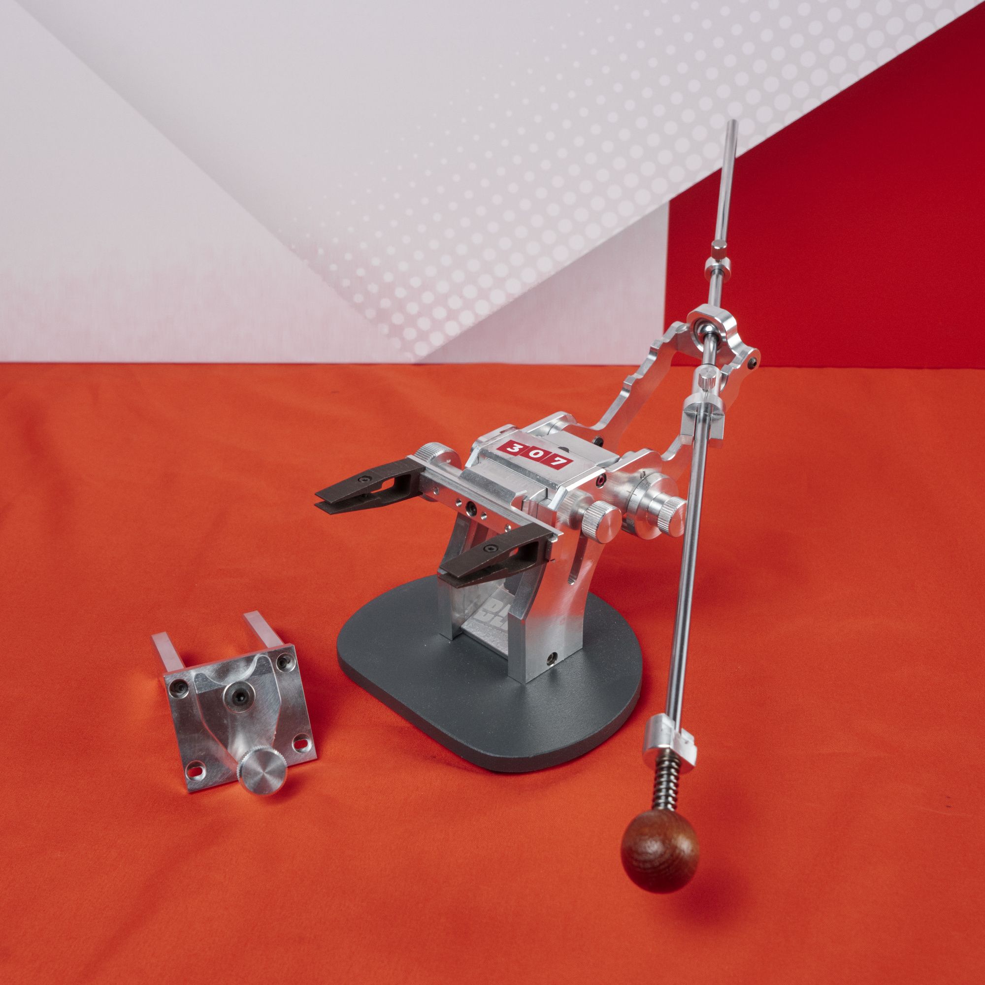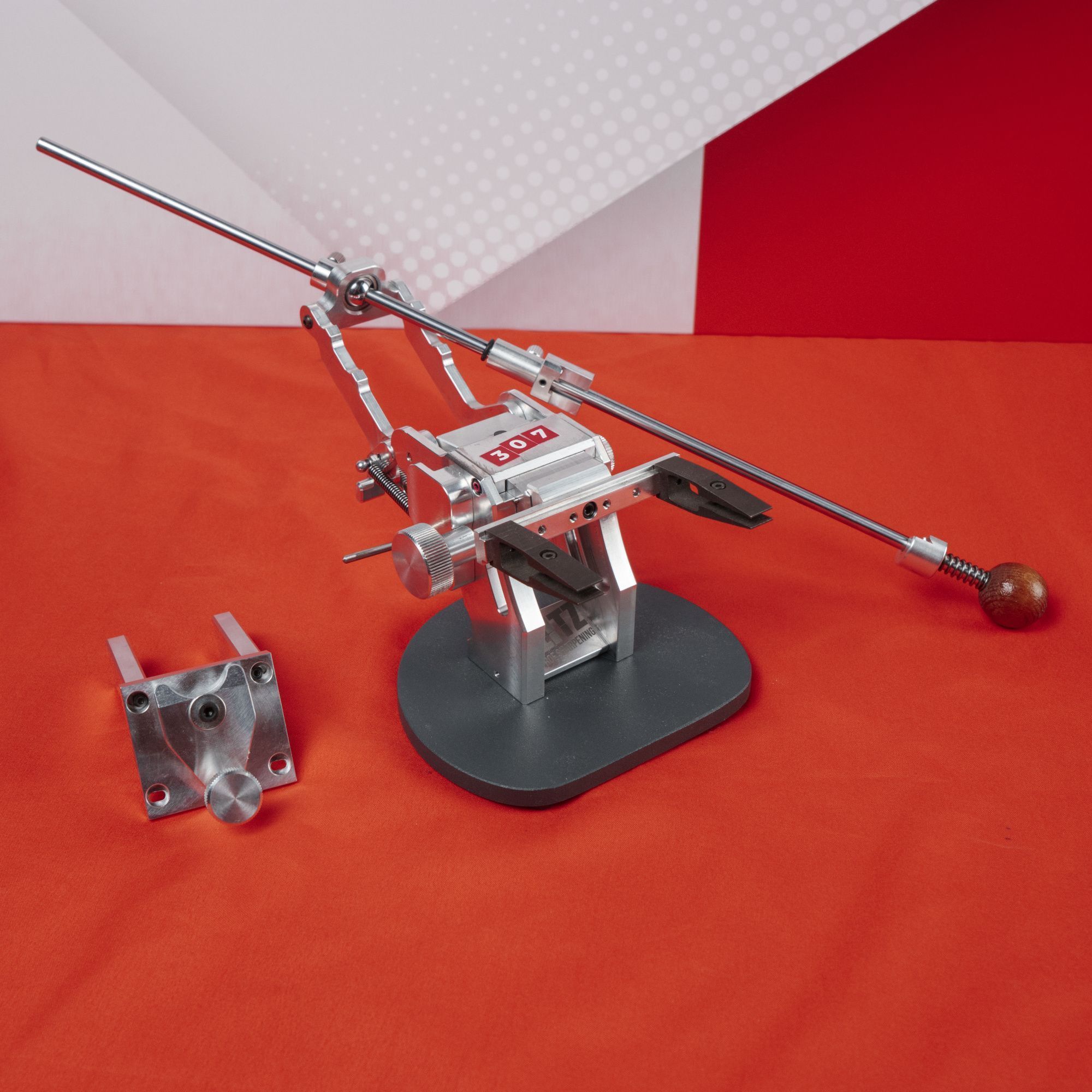 Это становится особенно важно на конечных этапах финишной заточки, когда необходимо контролировать «тонкое» прикосновение абразива, исключая влияние динамических нагрузок по перемещению держателя абразива в процессе заточки. Также следует отметить что это дает быстрое и равномерное изменение угла при помощи удобной рукояти вращения, оставляя абразив на месте и создавая благоприятные условия для наблюдения за лезвием.