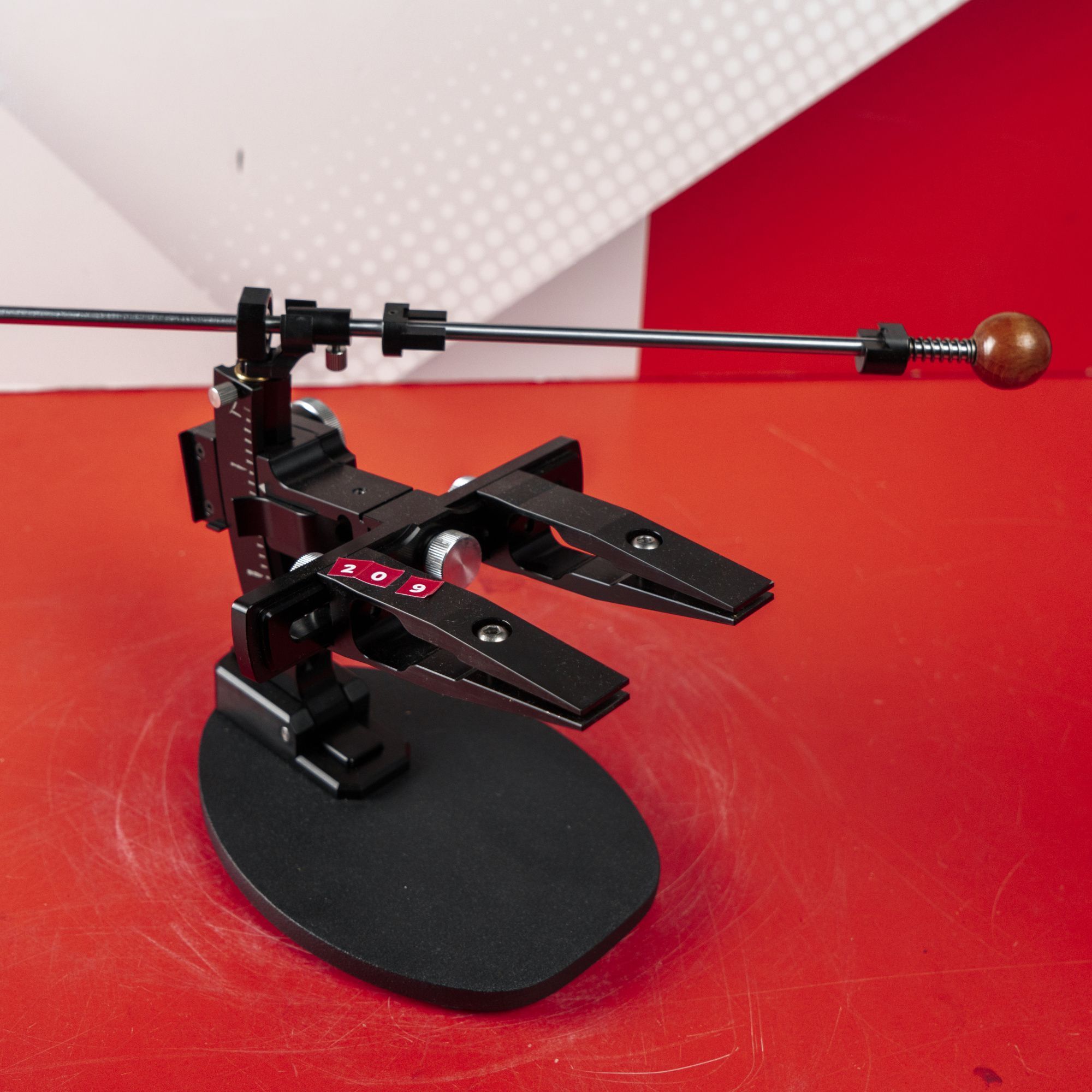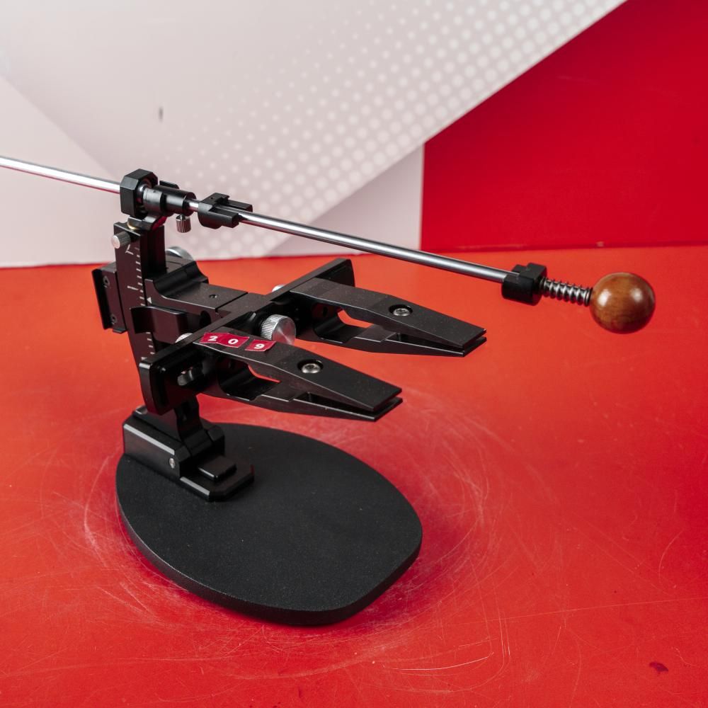 Поворотный механизм точилки TSPROF Kadet Pro помогает сохранить одинаковый угол заточки на обеих сторонах ножа. Допустимая погрешность при перевороте рамки составляет 0,4°. После переворота рычаг намертво фиксирует рамку с зажимами. Вращением ручки подъема, поворотный узел плавно движется вокруг виртуального центра, в котором находится режущая кромка ножа. Дуговая стойка изготовлена из единого куска алюминия и интегрирована с реечным подъемником с зубчатым зацеплением. Стопорный рычаг, после настройки необходимого угла, позволяет надежно зафиксировать крепление поворотного узла.