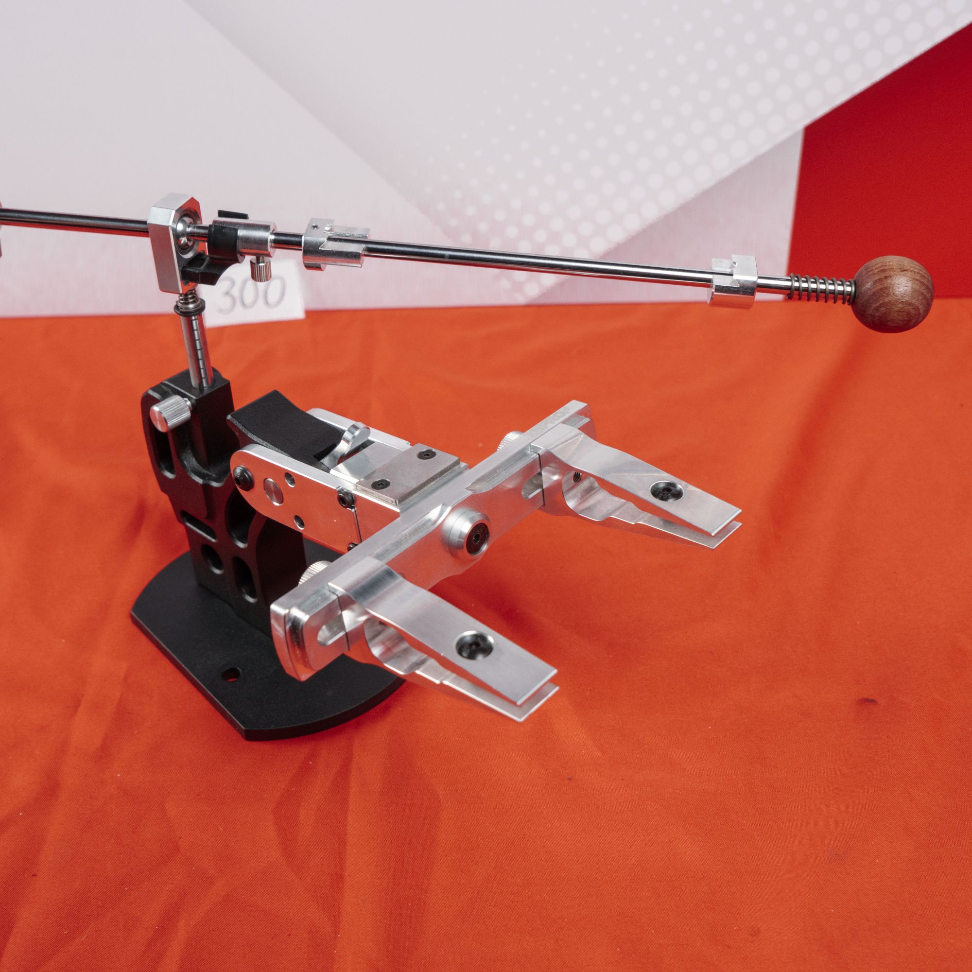 Ось настройки угла, плавно движется внутри рамы, фрезерованной из сплава авиационного алюминия. При помощи резинового кольца можно легко отследить и скомпенсировать изменение угла заточки при работе абразивами различной толщины.